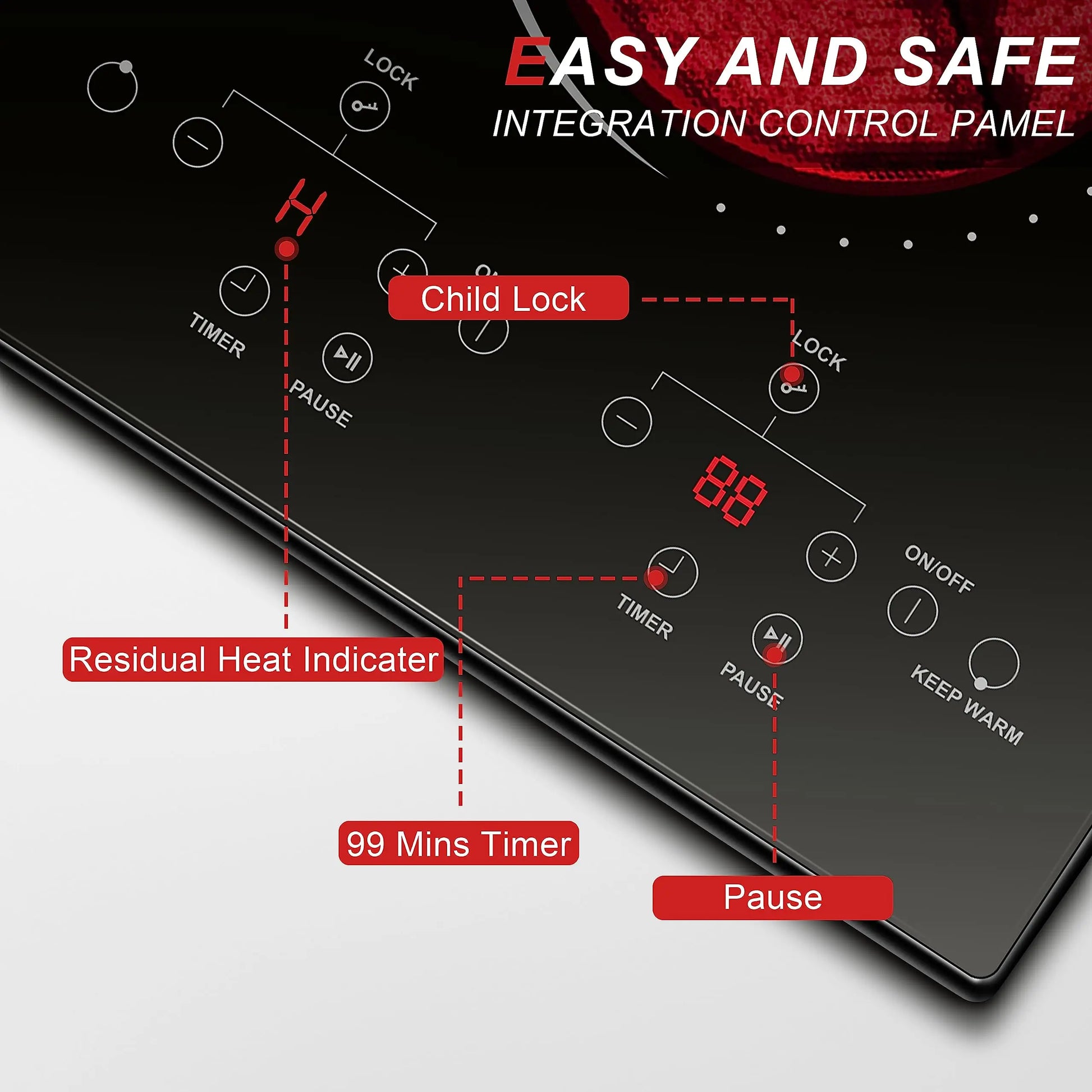 12 Inch 2 Burner Built-in Radiant Electric Stove,110v-120v Plug In,2000W,with Safety Lock, Timer, Over-Temperature Protection
