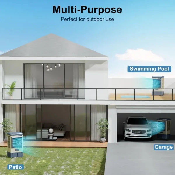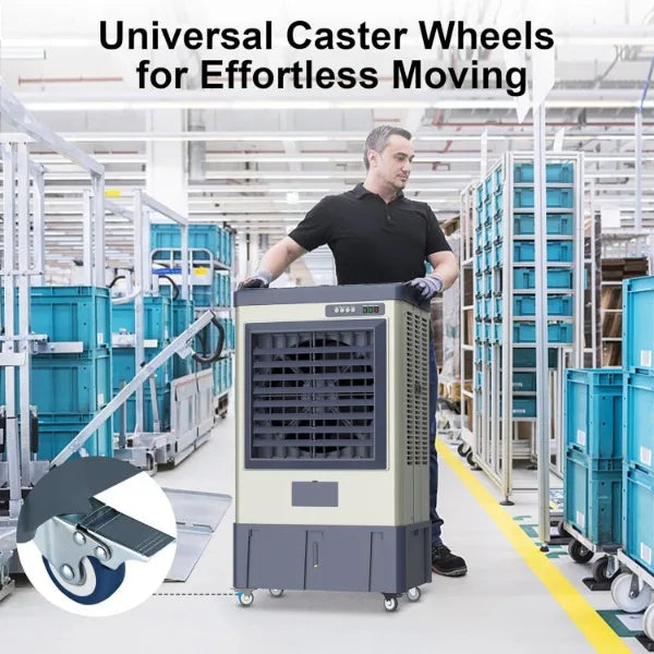 - ❄[4 ROLLING CASTERS for MAX MOBILITY] - The evaporative air cooler features 4 universal wheels(2 with brakes,2 without brakes). So this air cooler is not limited to one place, you can move to any space freely once you need cool, no matter backyard, garage, gym or more big spaces. Its magic can be felt even outside. Feel the cooling wind in the heat summer and while allowing you to feel the cool wind.