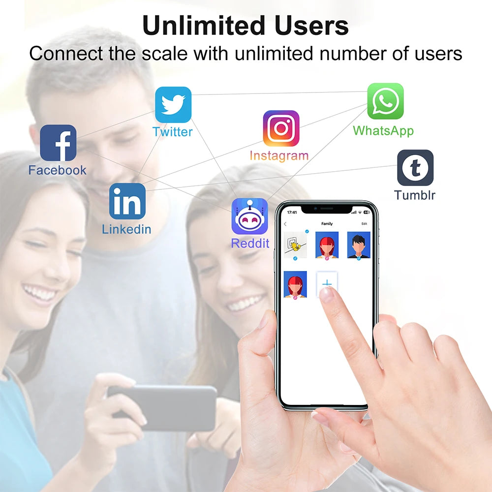 • A smart scale can be connected to multiple phones (not simultaneously). A Fitdays account can add 24 users. You can share the scale with your family and share your achievements on social platforms