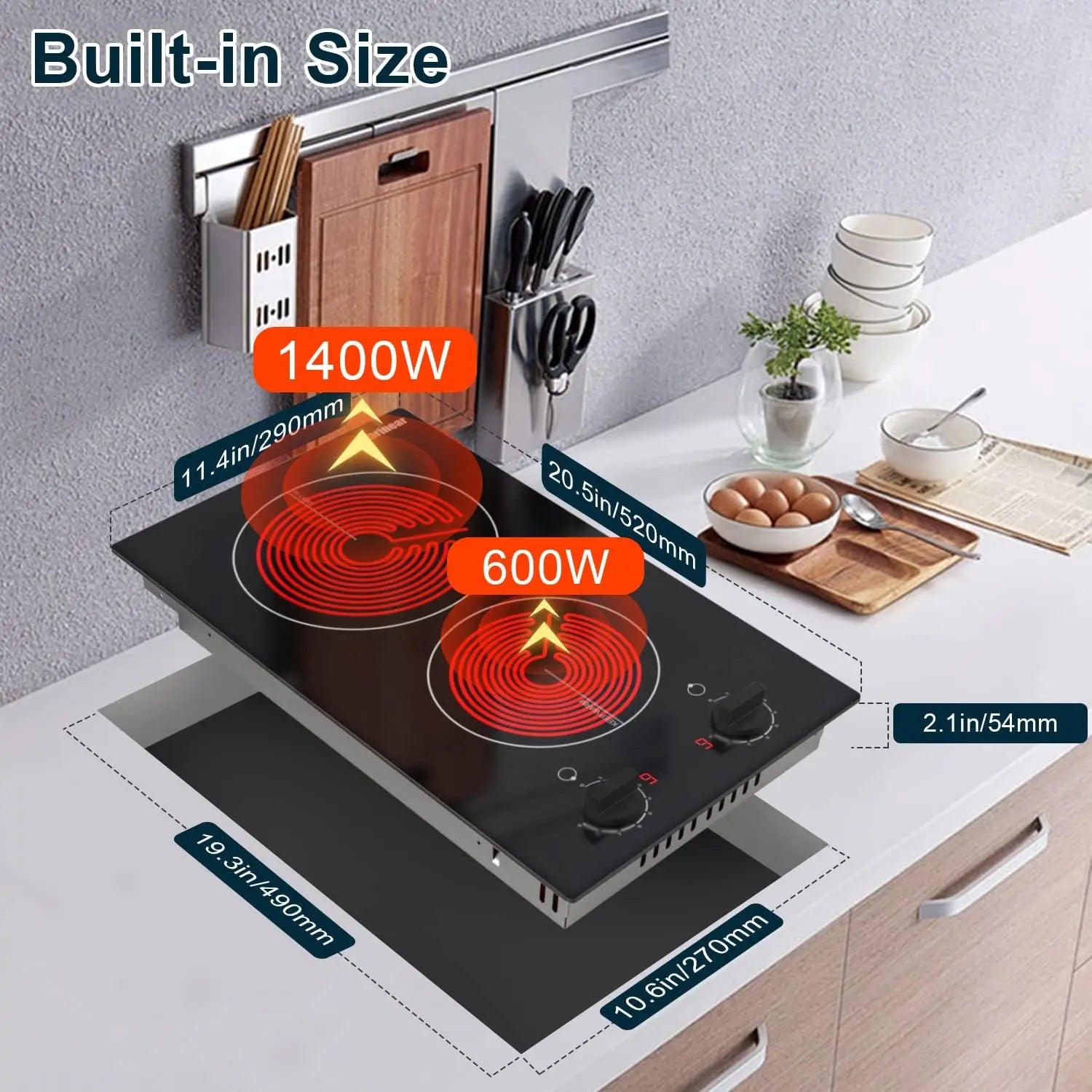 【Knob Control, Easy to Use】This 120 volt cooktop is operated by knob, it hasn't any complicated function buttons, knob control electric cooktop is very simple to use, perfectly for the elderly or people with poor eyesight. Once powered on, the electric ceramic cooktop can be heated by gently twisting the knob, and the electric cooktop 2 burners has 9 heating levels to meet the needs of any food at different temperatures.