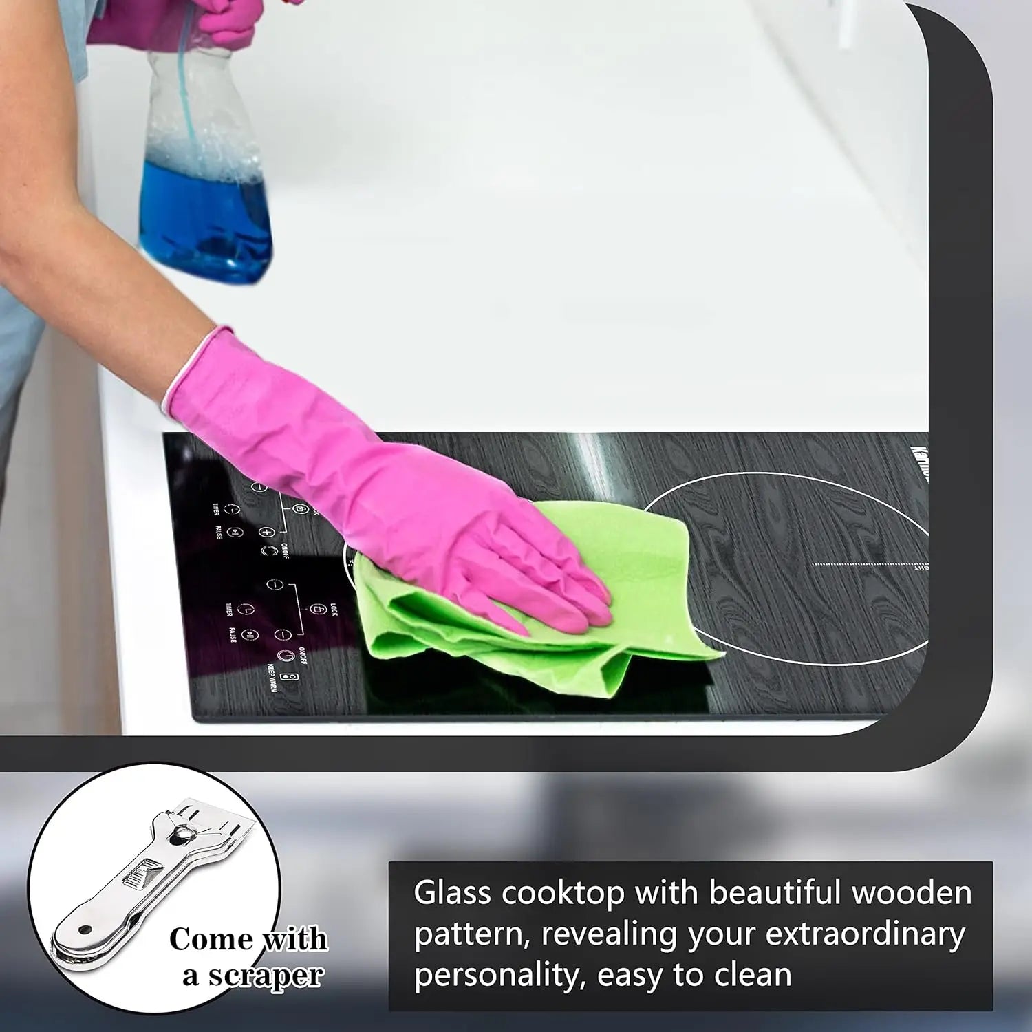 【Glass Cooktop, Easy to Clean】I guess you hate cleaning too. But don't worry, the surface of this glass electric cooktop is made of smooth glass, easy to clean, just need a light wipe with a damp cloth. Karinear will give a cleaning scraper as a gift to help you clean. (Be sure to wait for the 'H'(High Temperature Warning) to wear off before cleaning, otherwise it may burn your hands.)