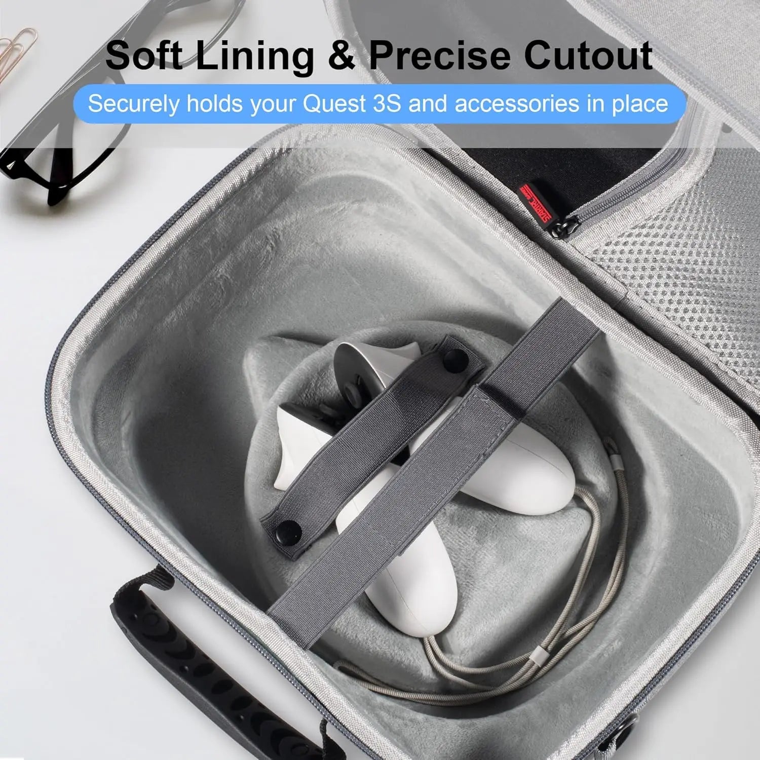 Sufficient Room: The travel case for Oculus Quest 3S perfectly fit VR headset, all of elite strap, controllers, charger, cables and other accessories(NOT included).