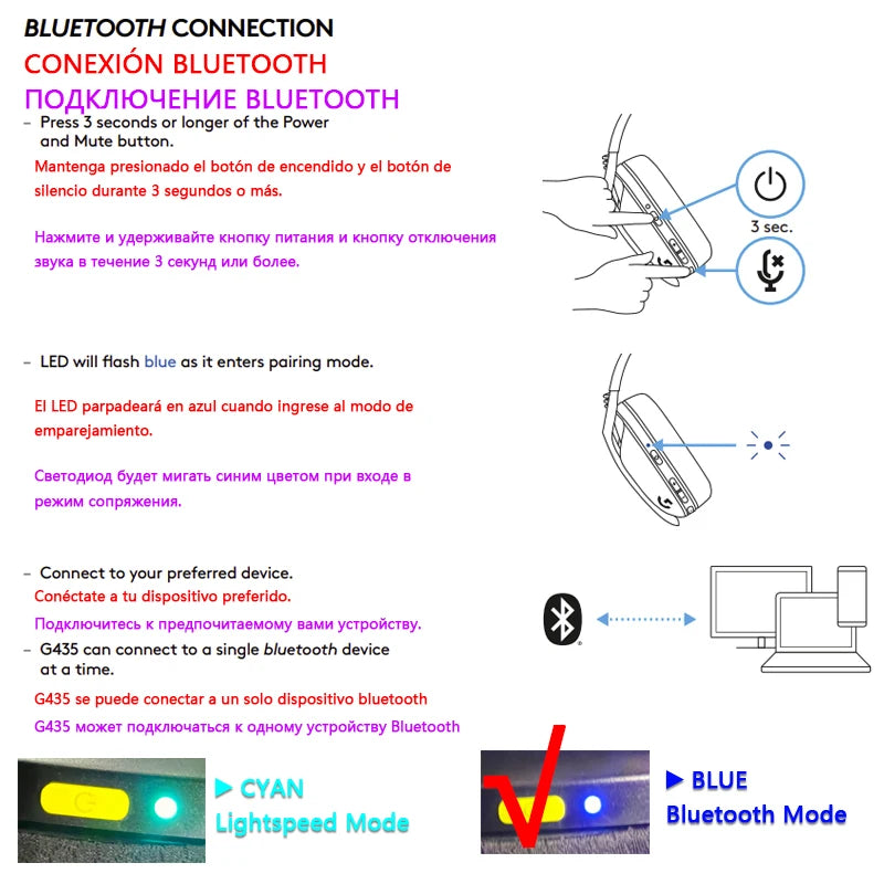 Long press the mute button to change the light color, blue is Bluetooth mode, cyan is USB dongle (Lightspeed) mode