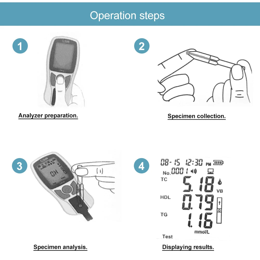 The analyzer applies the principle of photochemistry and is used with blood lipid test strip(ML-301) .The whole blood sample to be tested is added into the sample area of the strip. In the process of rapid infiltration, blood cells are filtered out or dissolved. The substrate react with enzymes and chemicals in the reaction layer and lead to the color change, then the color intensity is proportional to the concentration of the substance. The analyzer tests the color intensity of the reaction end point at the wavelength of 620nm, the substance concentration is calculated by the reflection coefficient.With the following formula the concentration of low density lipoprotein cholester in (LDL) is calculated, the ratio of TC and HDL can also be calculated. LDL=TC-HDL-TG/5 (mg/dL) or LDL=TC-HDL-TG/2.2 (mmol/L)