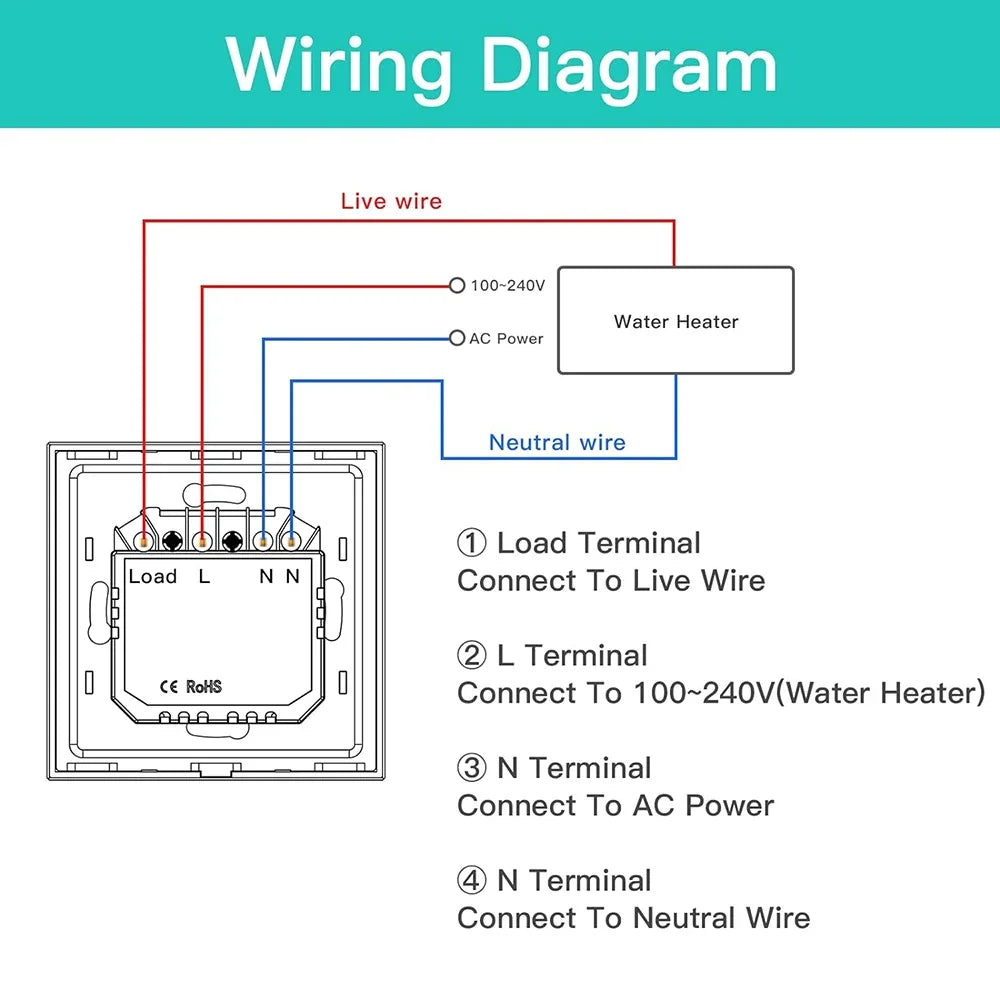 Easy To Install: The switch needs to be connected to both the live wire and the neutral wire to finish installation. Please note the router must be 2.4GHz (5.0 GHz WiFi is not supported), but there is no limitation for smart phone network (2G/3G/4G/WiFi network is ok) and one button just apply to one water heater device.