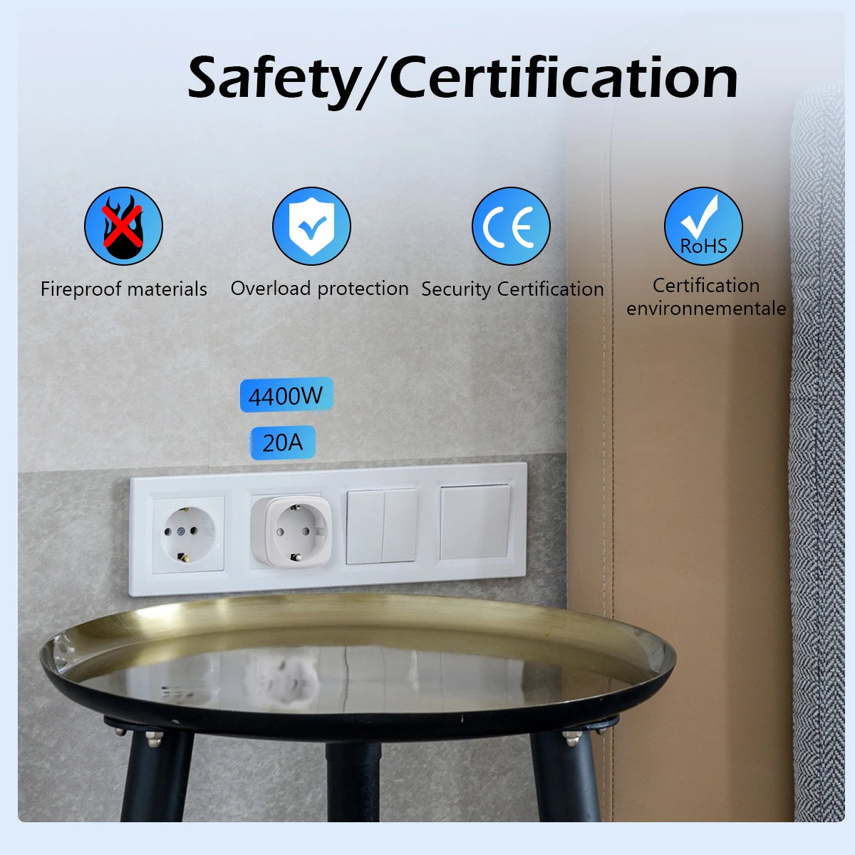 16A,3680W / 20A, 4400W maximum power; 20A support water heaters, air conditioners.