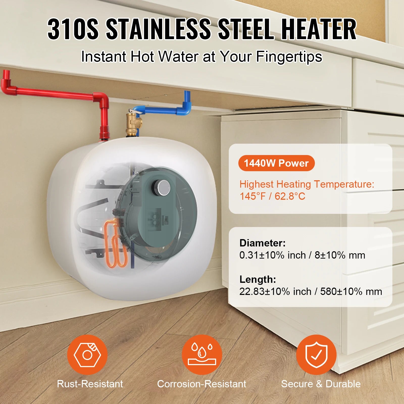 310S Stainless Steel Heater: At 1400W high power, this mini water heater provides constant hot water 24/7. It reaches up to 145°F / 62.8°C. An anti-corrosion inner tank for lasting warmth, durability, and leak prevention.