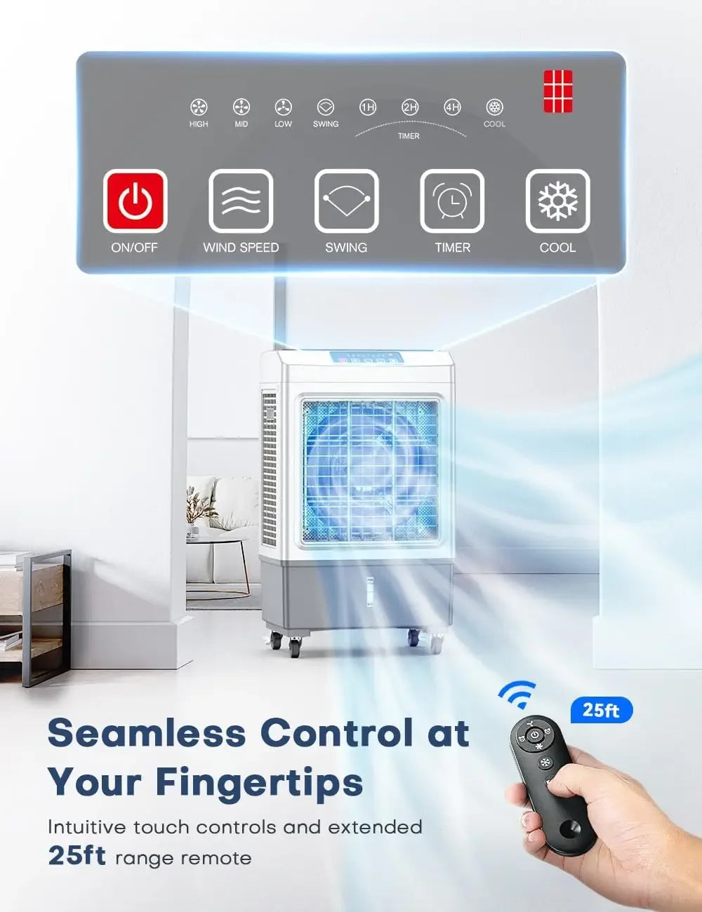 360° rotating wheels make the evaporative cooler convenient to take it anywhere for instant relief from the heat easily.